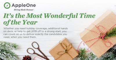 We're here to help you stress less and celebrate more. Whether you need holiday coverage, additional hands on deck, or help to get 2019 off to a strong start, you can count on AppleOne to deliver the talent you need, when you need them!