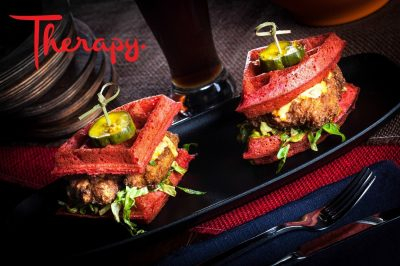 Therapy is famous for its red velvet and fried chicken waffles, but don't miss the fried mac and cheese croquettes with bacon tomato jam and aioli sauce.